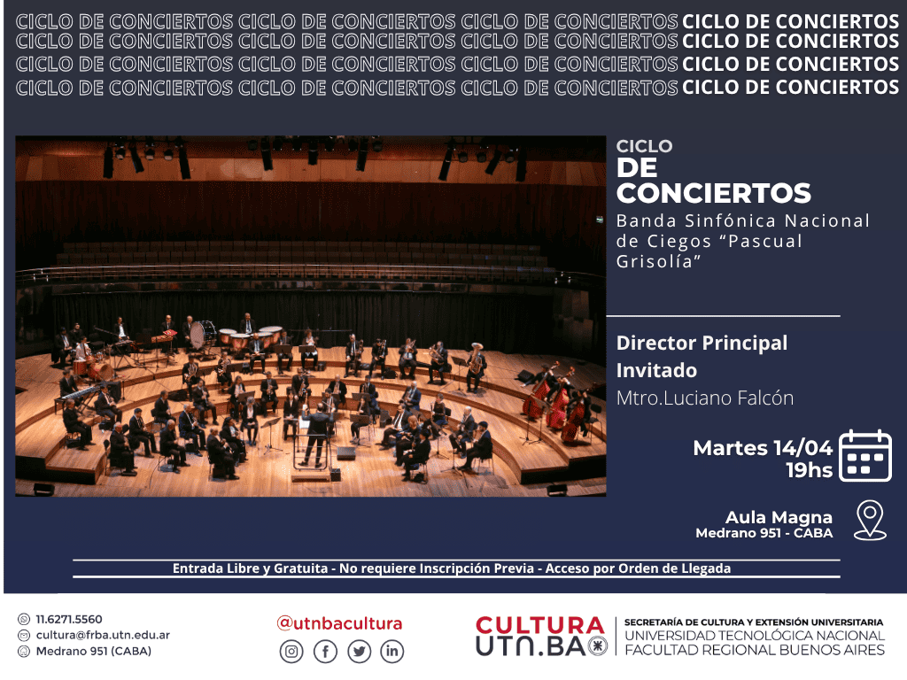La Banda Sinfónica Nacional de Ciegos “Pascual Grisolía” es un organismo artístico pionero en el mundo, con una destacada trayectoria musical, cultural y social. En esta presentación ofrecerá un repertorio que recorre obras de Albinoni, Holst, Bizet y grandes autores argentinos como Piana, Di Sarli y Piazzolla, en un concierto de gran riqueza sonora y sensibilidad artística.